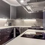 Hay lavaplatos y un horno en una cocina completa. El apartamento tiene una terraza.